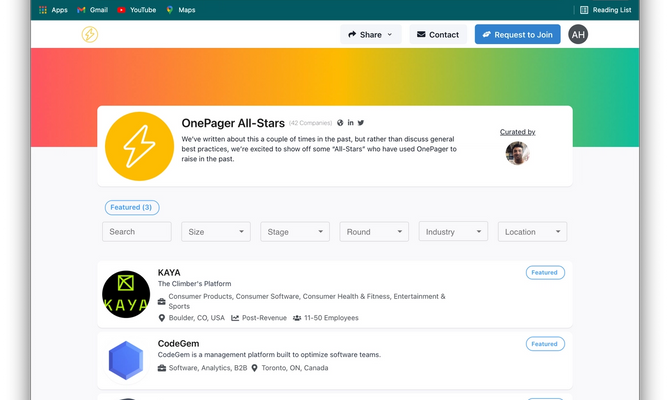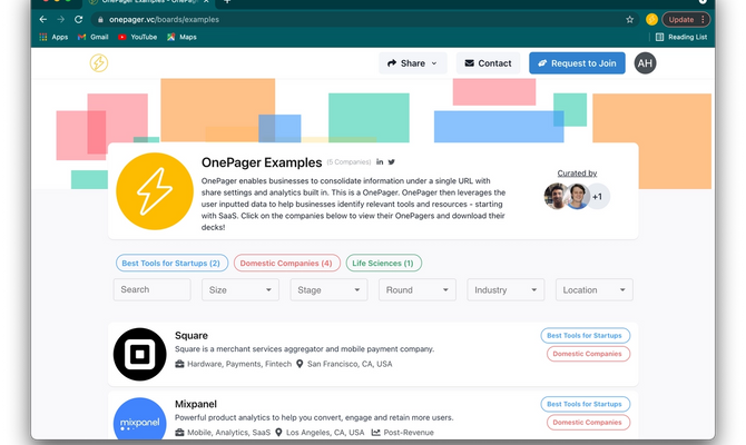 GSV Bootcamp leveraged OnePager & Boards to easily consolidate and share information about hundreds of companies from a single URL.