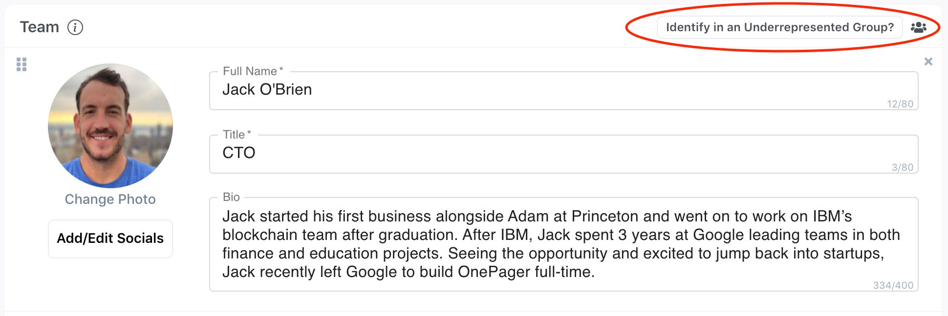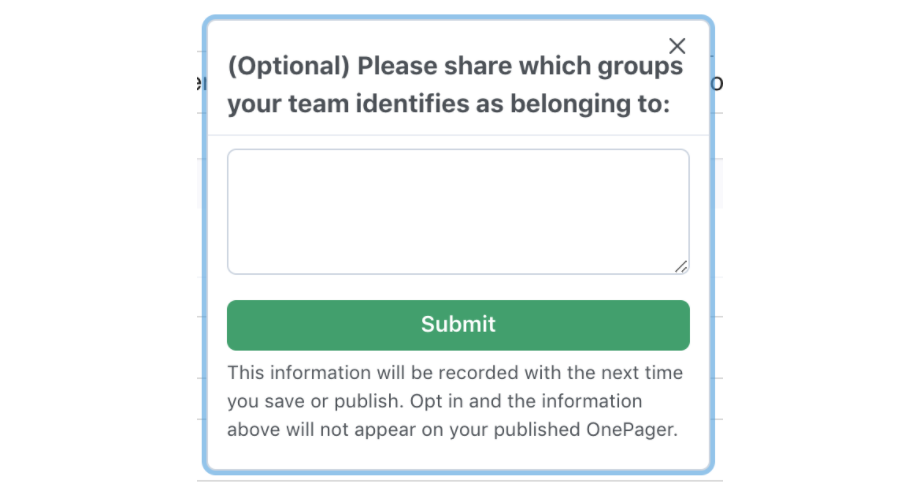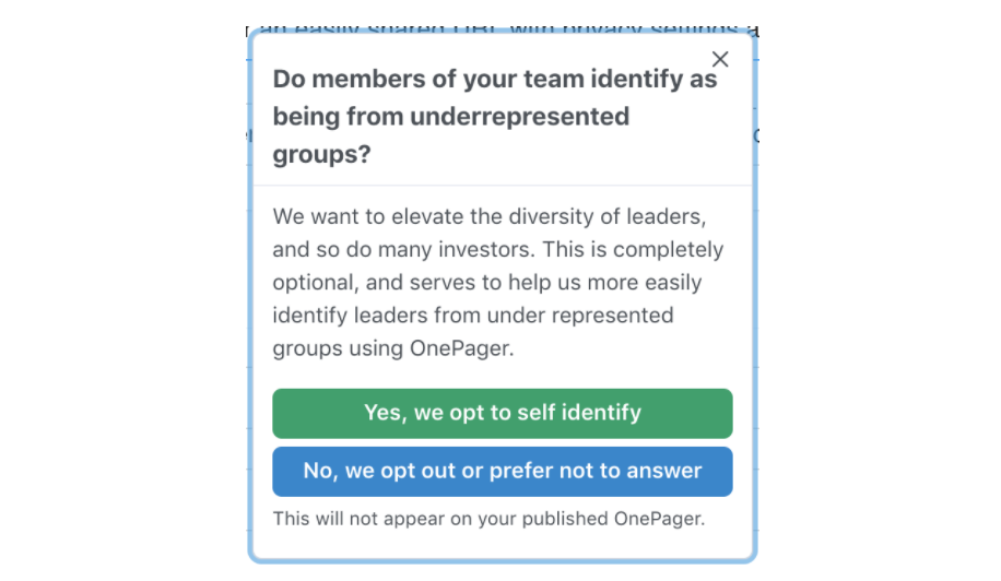 The OnePager tool now includes a simple opt-in for founding teams to self identify. Currently, this opt-in does not show on a published OnePager, and it will only serve to help us more easily identify founders from underrepresented groups. Eventually we’d like to specifically highlight these companies to dedicated investment groups and publish statistics on the makeup of founders raising with OnePager. These are small first steps, but we’re excited for where this data could lead.