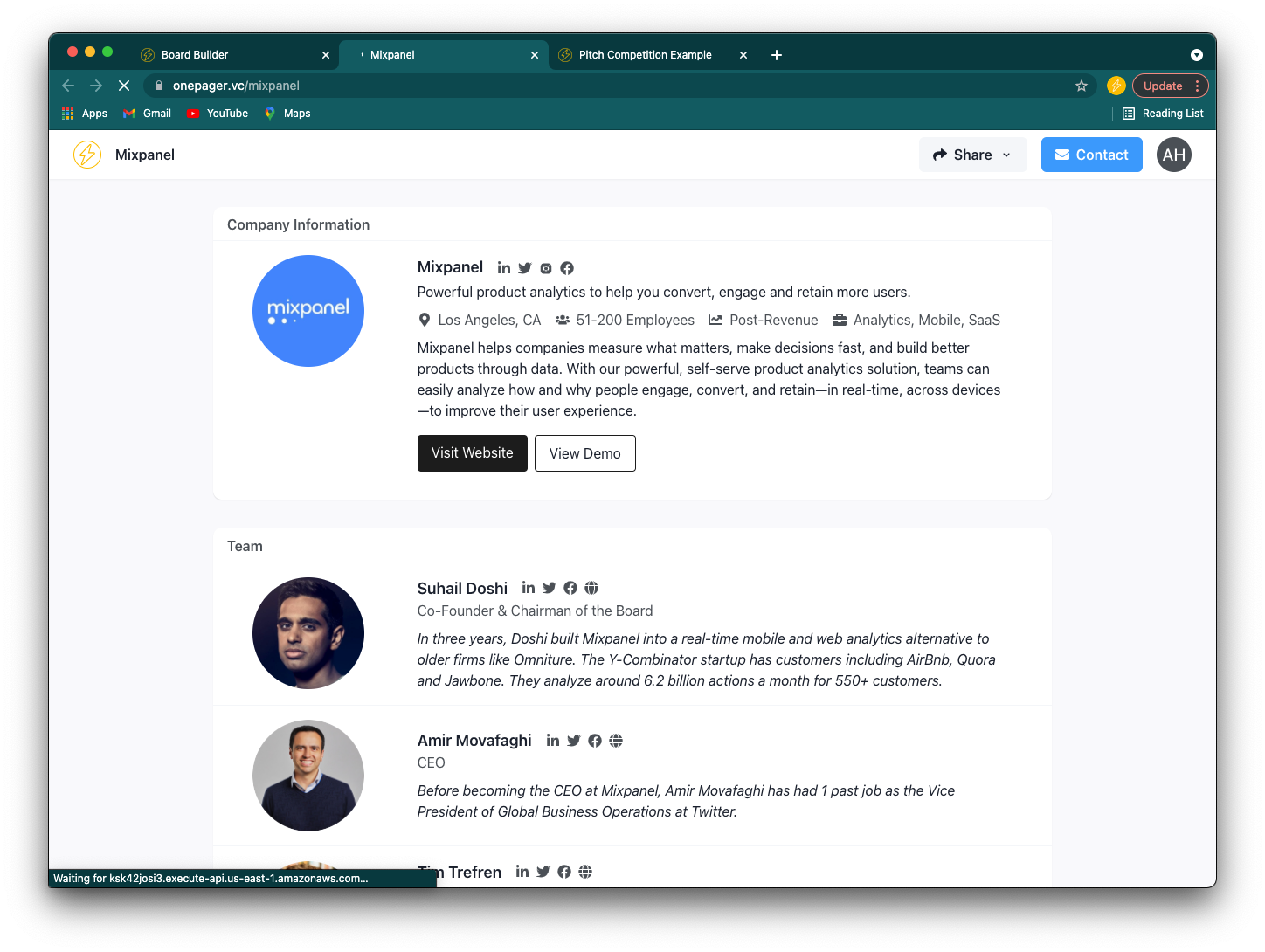 With Boards and OnePager it becomes easy to not only announce the finalists and winners, but to also help everyone who applied get some exposure. In our experience, this makes it easier to gather submissions as there is a minimum value founders are guaranteed to get rather than there being a chance of receiving nothing for their efforts. This is possible because you already have all of their information in an easily presentable format thanks to OnePager and it’s already shareable thanks to Boards.