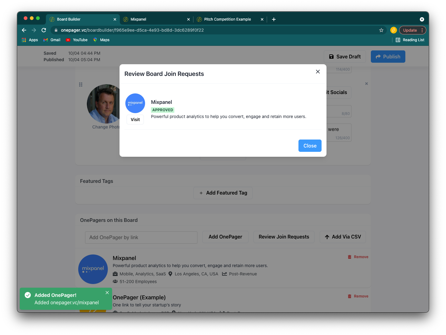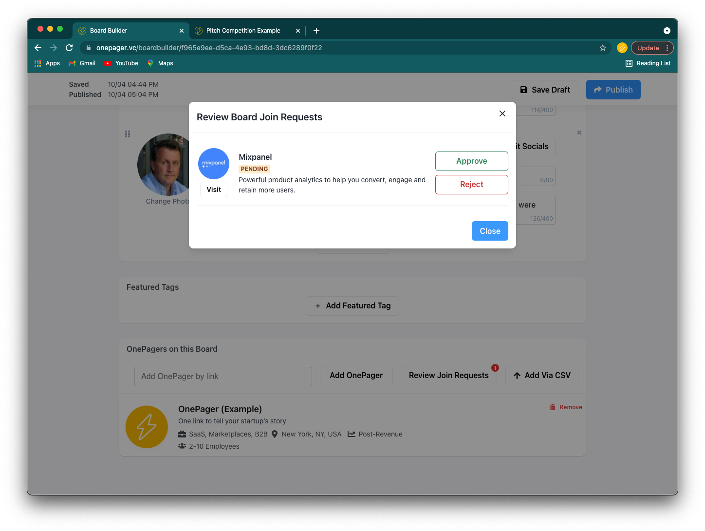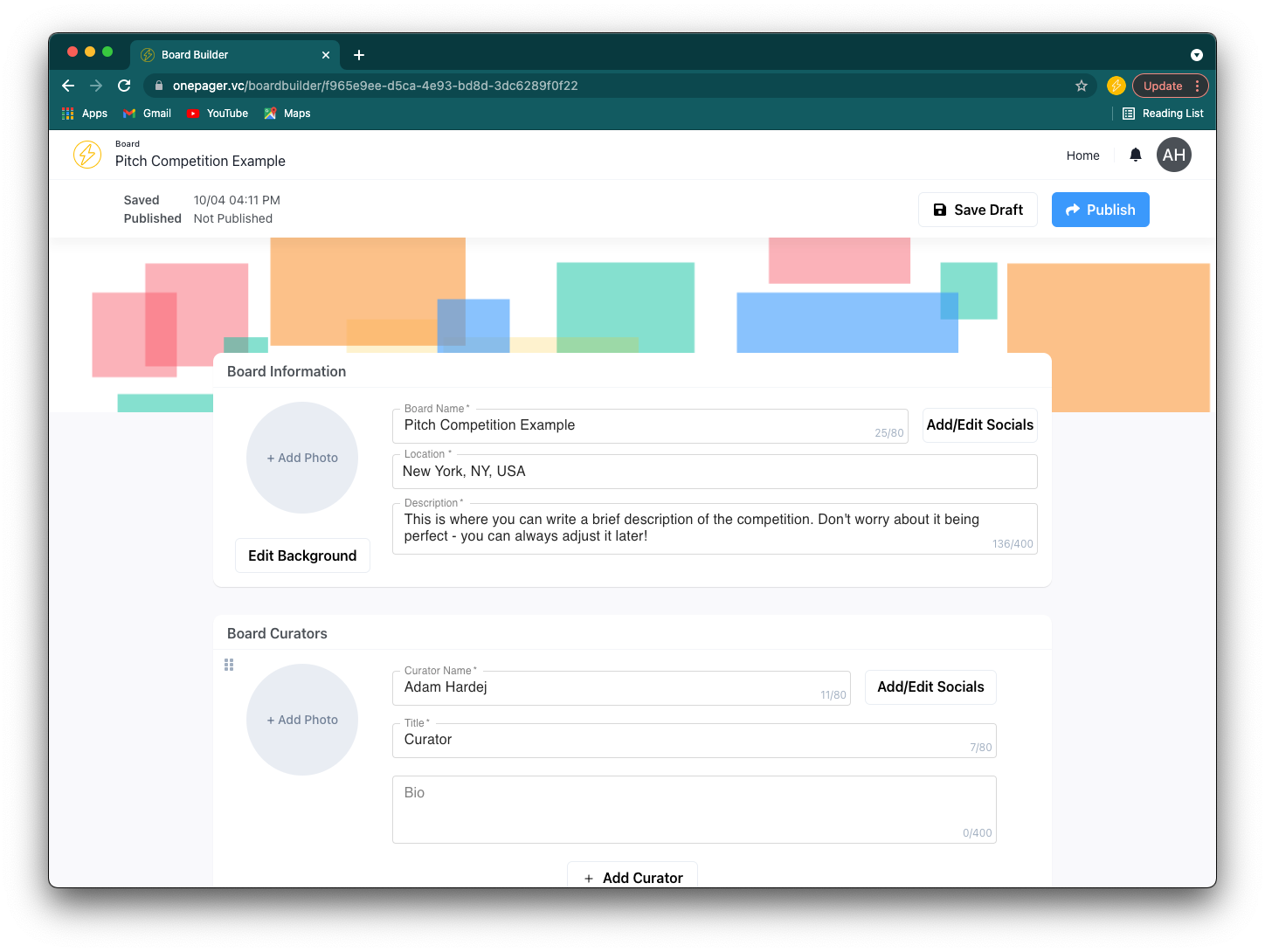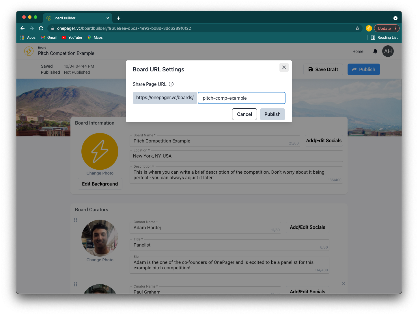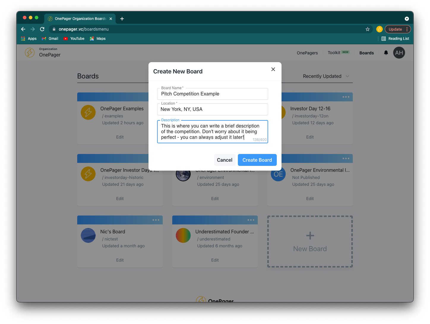 - You will need to have at least one OnePager included in your Board before you’re able to publish it. This is a great opportunity for you to create an example of what you would like a OnePager submission to look like for the competition. Does it require a pitch deck? Do founders need to answer certain FAQ questions? You can communicate all of this simply by creating an example like this and you can read more about OnePager best practices here.