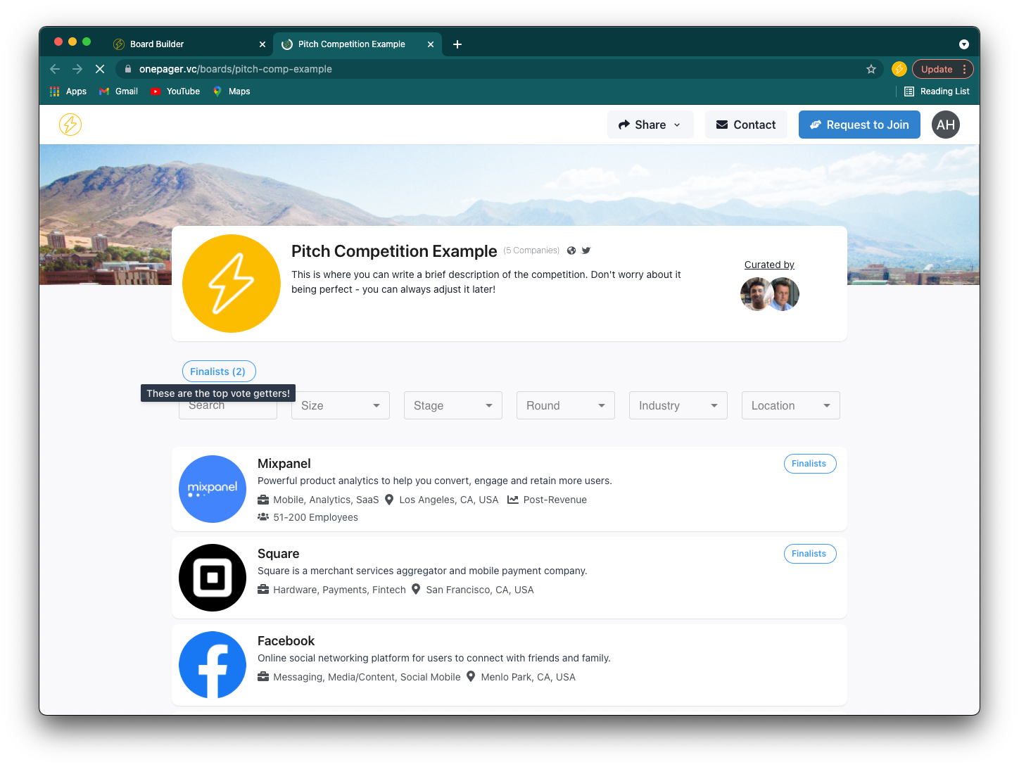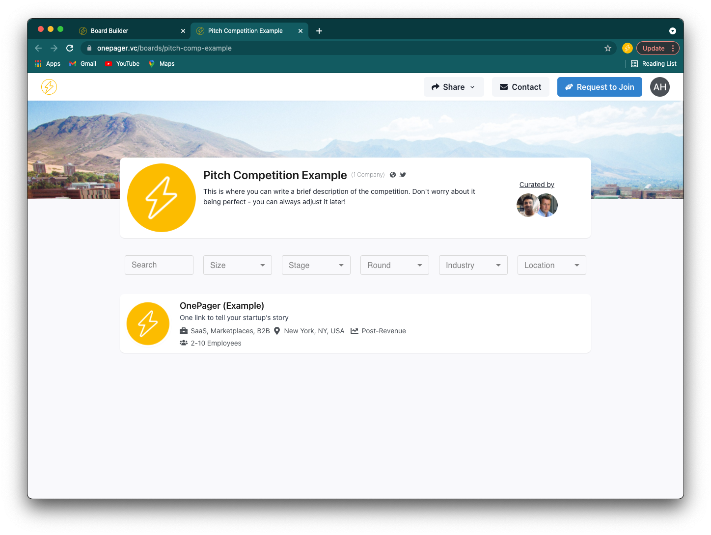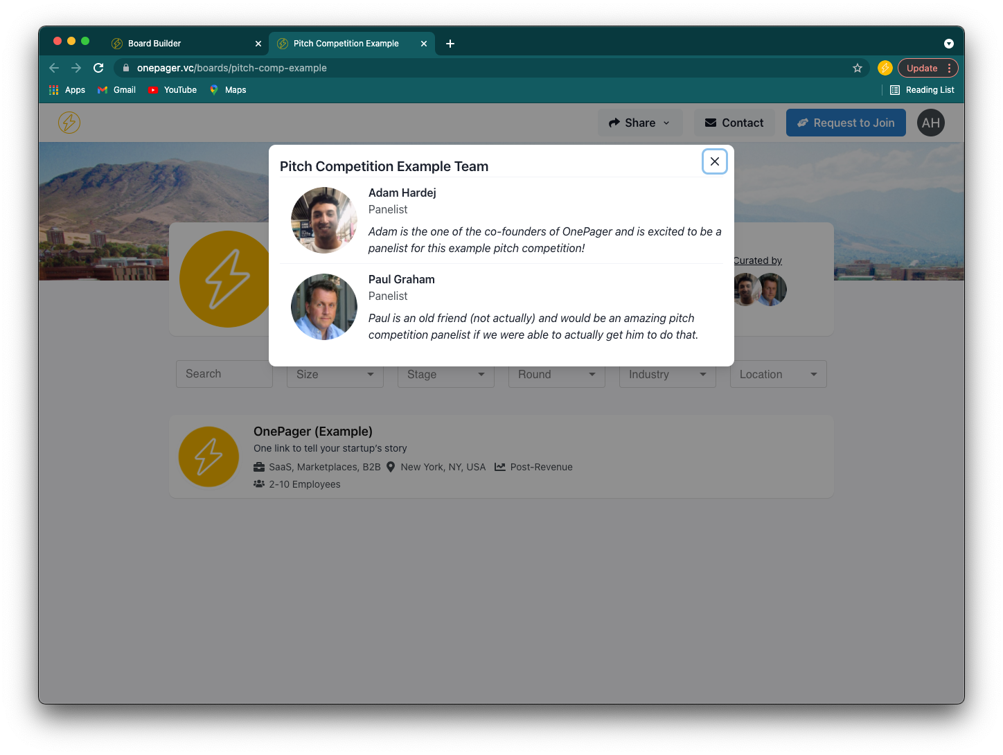 Once you’ve published your page you will be able to easily share your custom link (https://onepager.vc/boards/pitch-comp-example for example) and direct people to information about the competition itself, the panelists, and what you need to put together to apply!