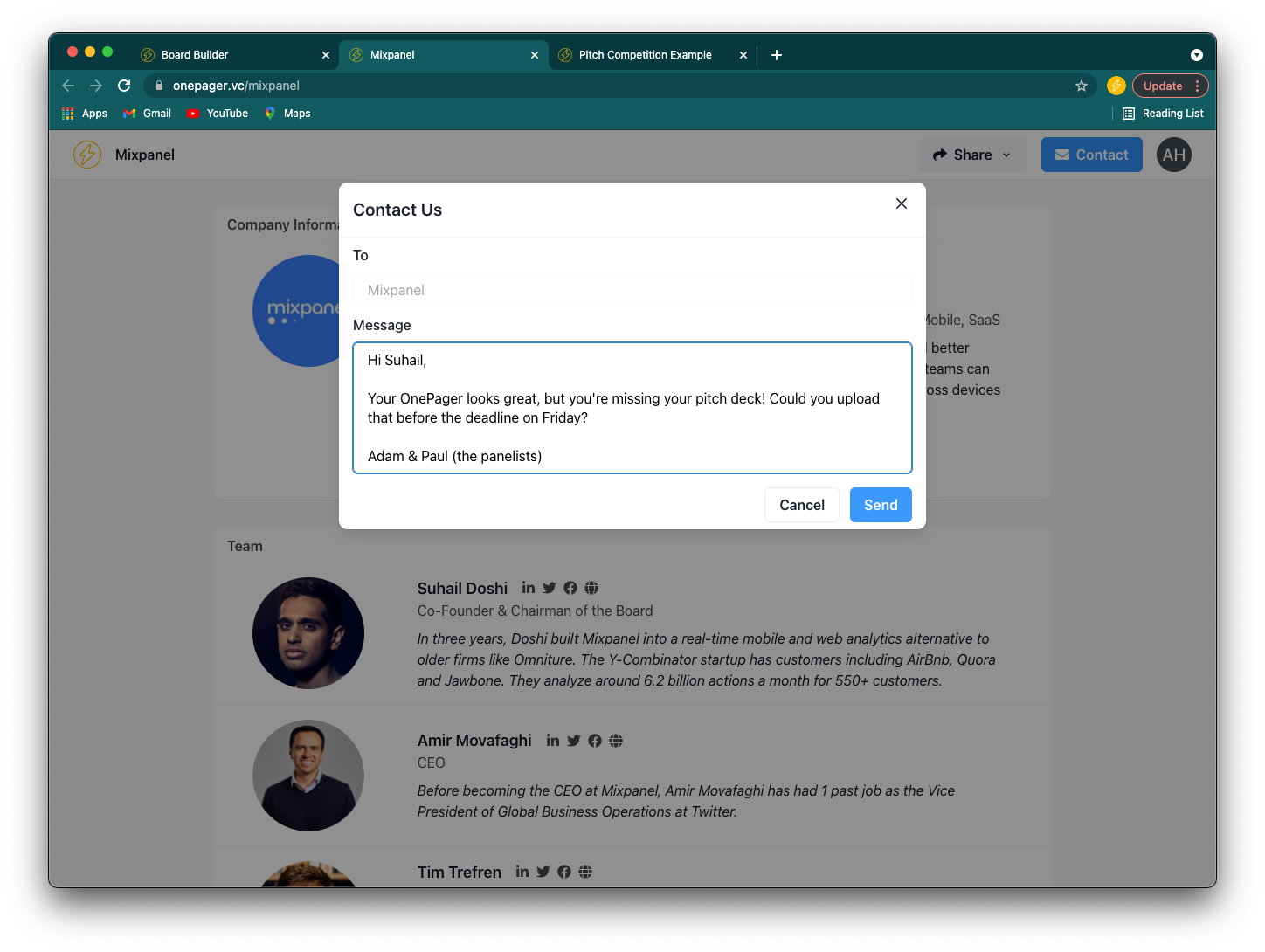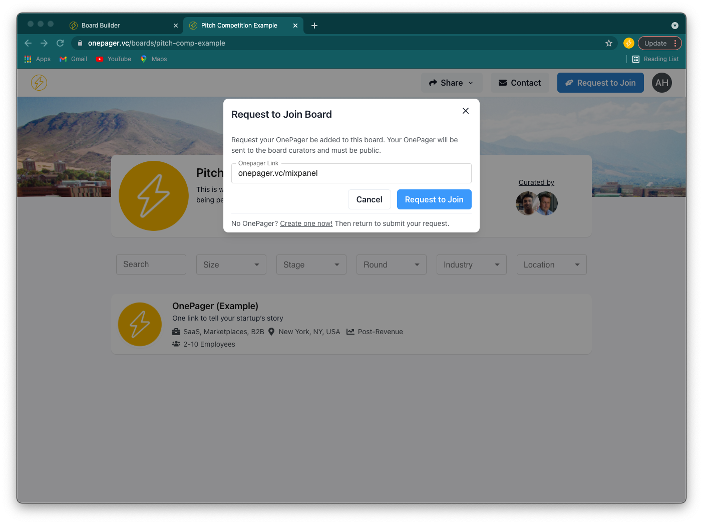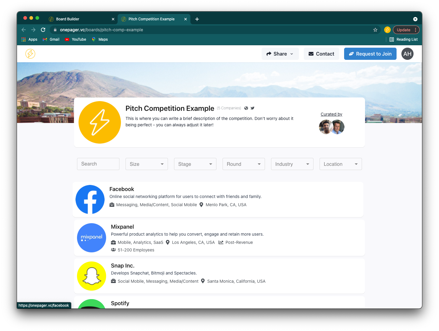 Once you’ve published your page you will be able to easily share your custom link (https://onepager.vc/boards/pitch-comp-example for example) and direct people to information about the competition itself, the panelists, and what you need to put together to apply!