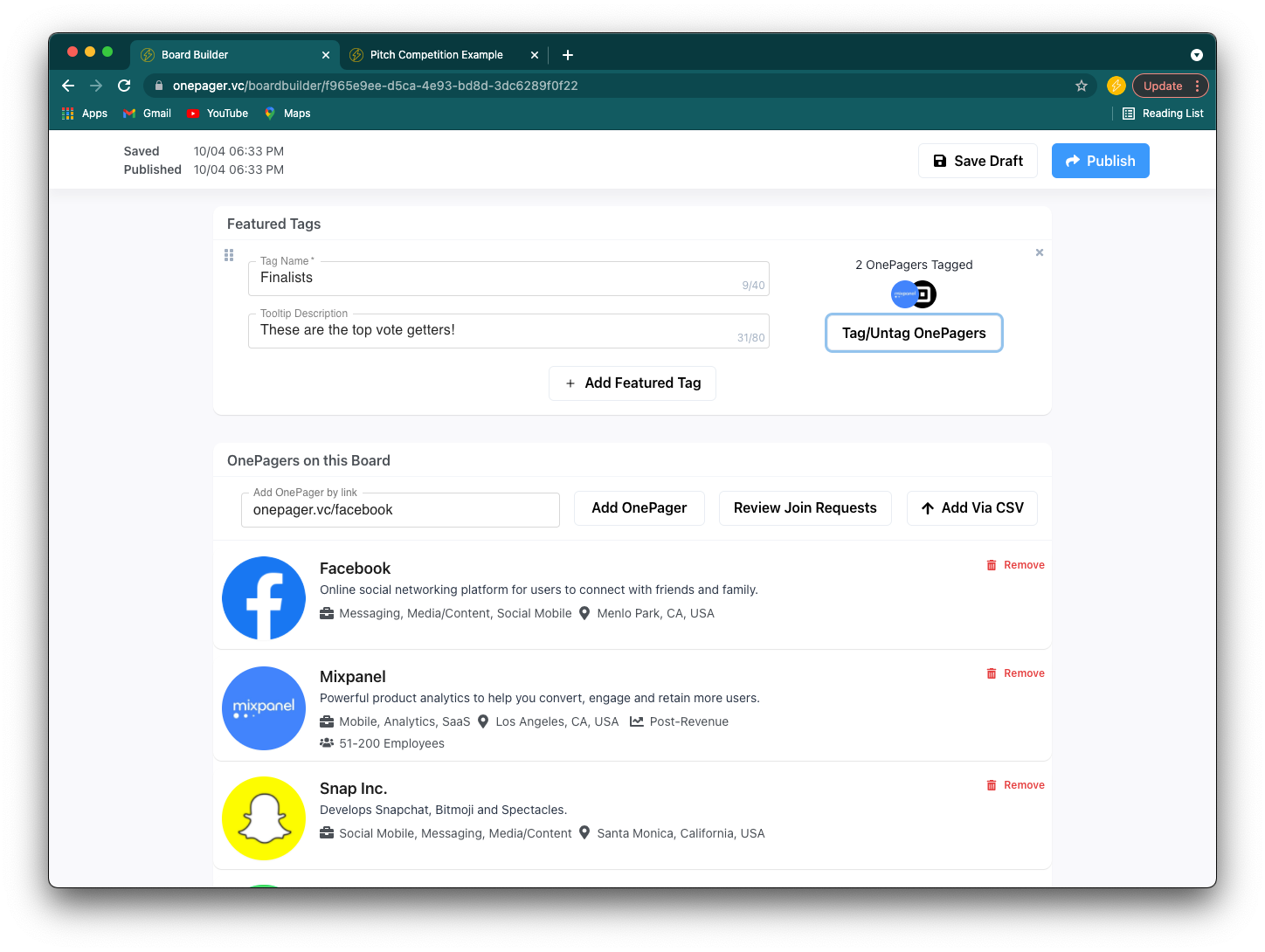 In the Board Builder, you can create a custom tag (as seen above) and add OnePagers to the list. You can add as many as you would like and they will all show up with that tag on the published OnePager so that viewers can easily sort the whole group.