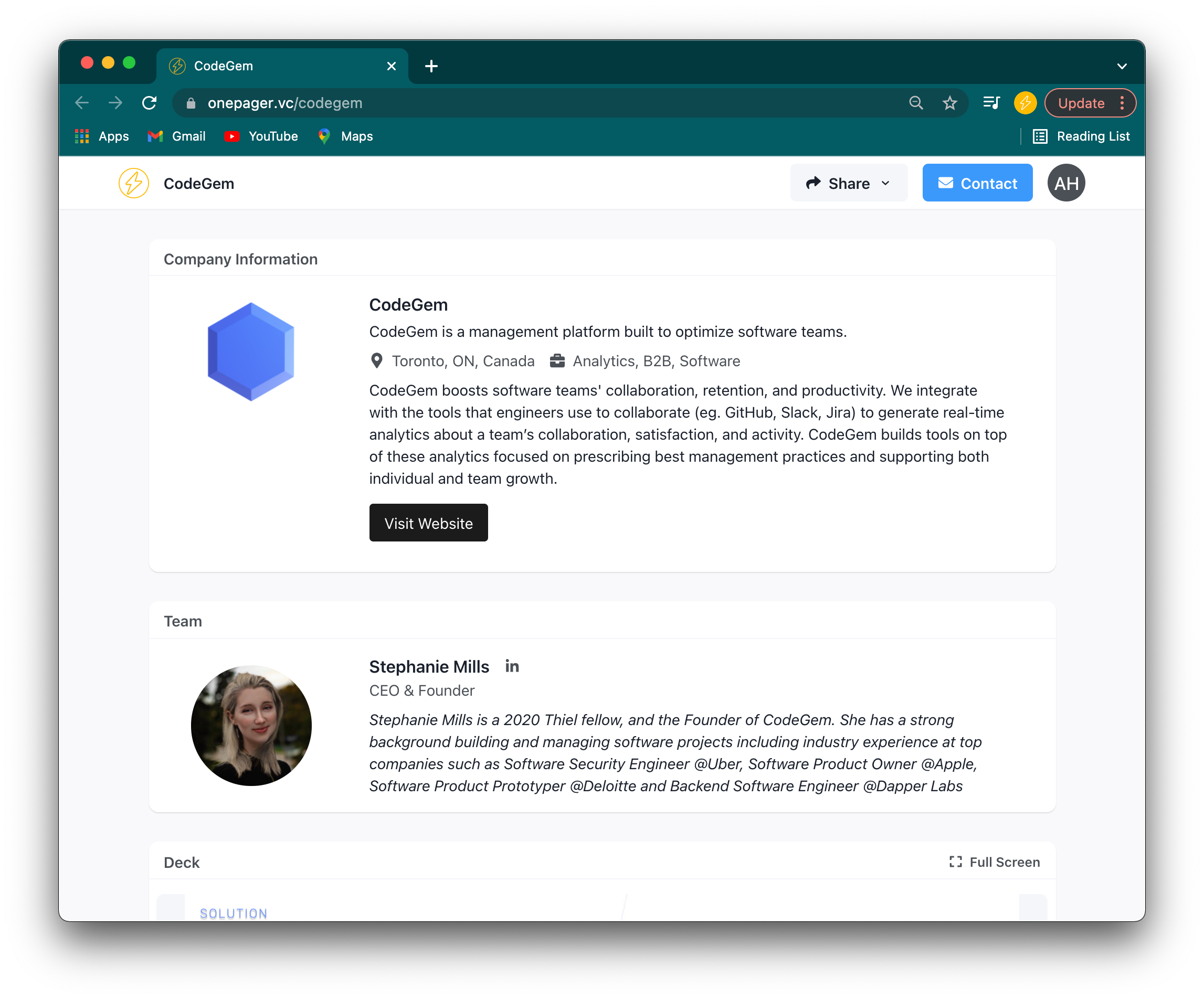 - CodeGem does a great job of making a complicated product feel understandable. Their pitch deck is an excellent example of this. B2B solutions can be complex and multi-faceted, but you shouldn't let that keep you from being concise. Their 18 slide pitch deck does a great job of being thorough without being too long.